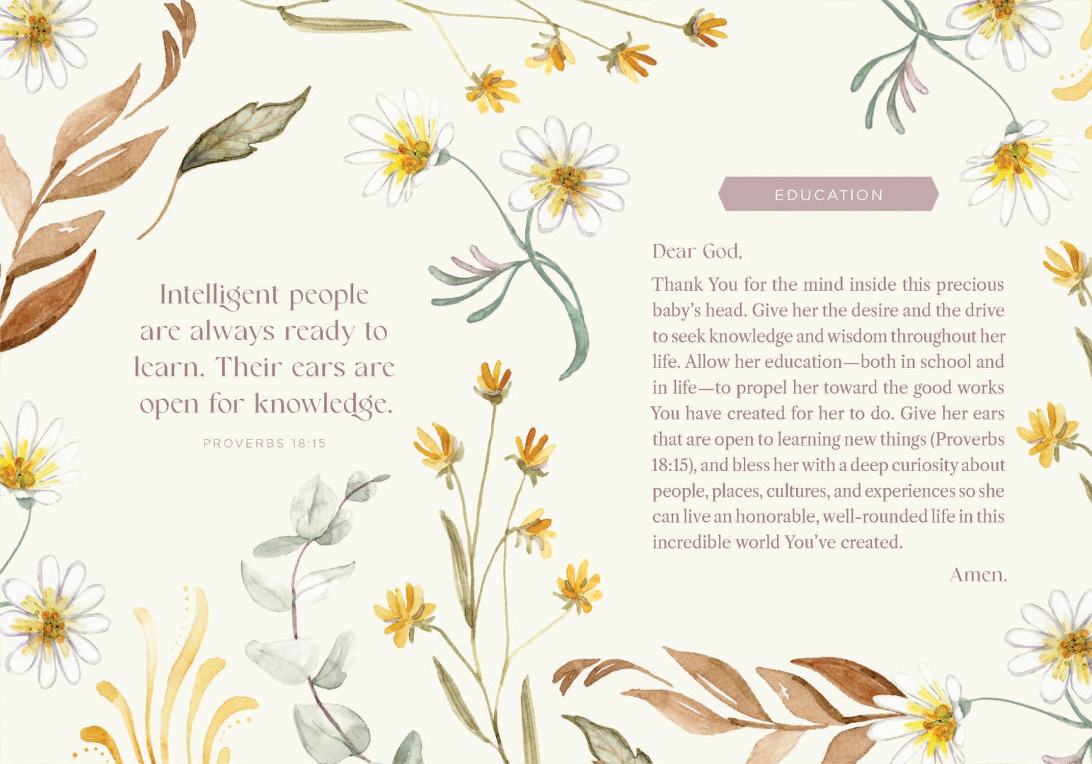 Beautifully written and illustrated, this highly giftable book features 40 life-changing prayers to help parents speak spiritual truth and blessing over their newborn girl's life. Christian parents hold special dreams for their baby girl's future, hoping that she will grow to become wise, kind, and most important, a believer in Jesus Christ. Each prayer addresses a different, important area of a girl's life, including her education protection purpose relationships salvation These short yet powerful prayers are perfect for your quiet time with God, for praying over an unborn girl, as a thoughtful baby shower gift, or as a meaningful way to congratulate new parents. Give yourself or a parent you know the life-changing gift of prayer.