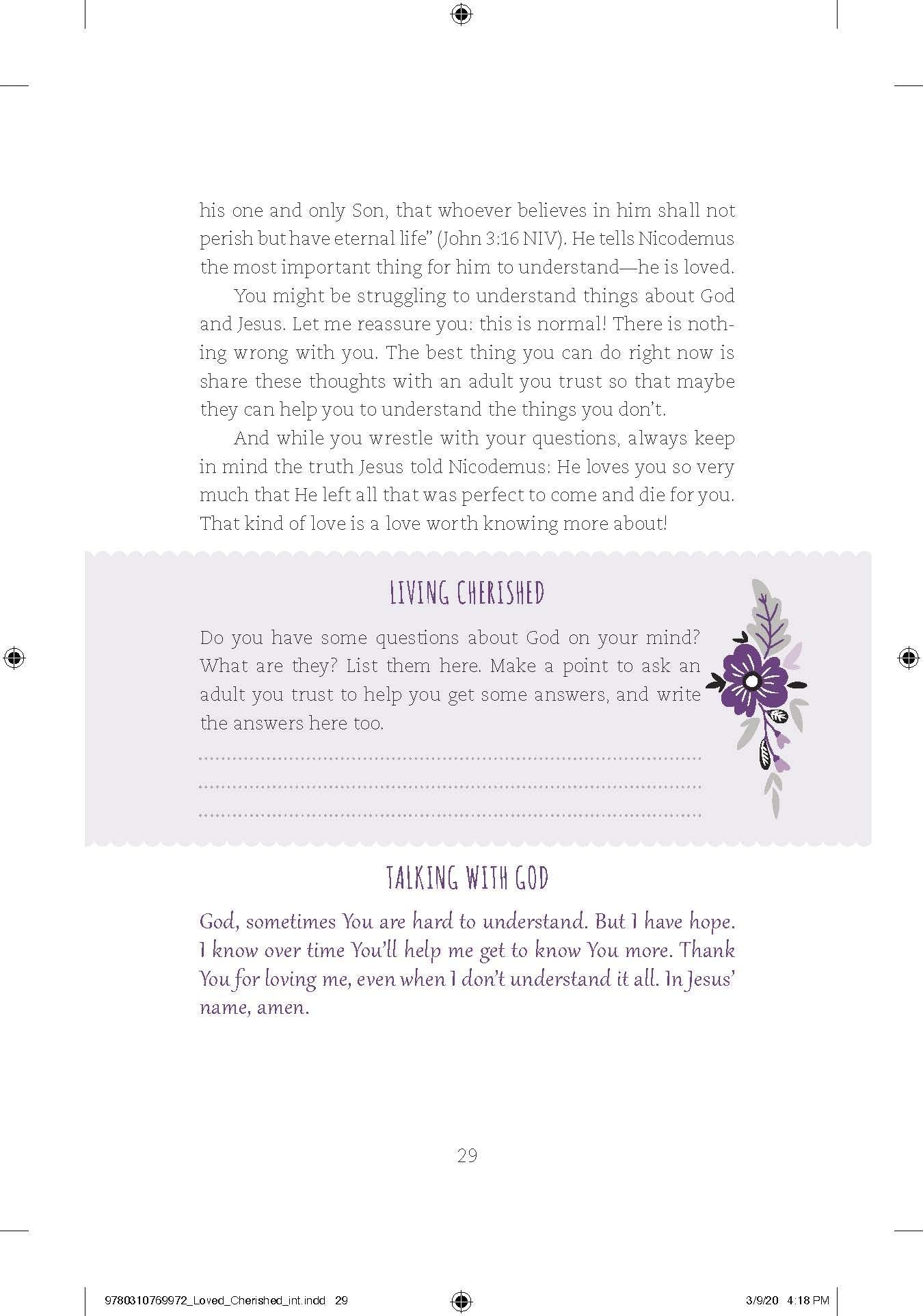 Loved and Cherished equips girls ages 8–12 to: Discover perfect, unconditional love in God, and that she doesn’t have to perform or be perfect to receive that love.