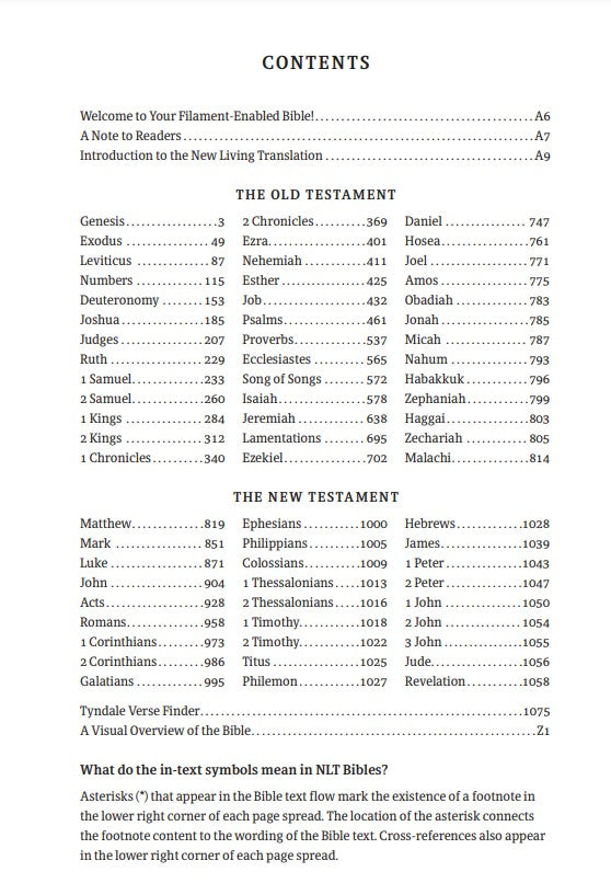The Bible Reading Experience: Reimagined The new Tyndale classic NLT Large Print Thinline Reference Bible, Filament-Enabled Edition has readable text, an attractive layout, and cross-references in a thin, easy-to-carry size. And while it has the same low price as basic text-only Bibles, the NLT Large Print Thinline Reference offers much more. It not only features a bold new design and the trusted and much-loved New Living Translation (NLT) but also includes the groundbreaking Filament Bible app. This app enables you to use your mobile phone or tablet to connect every page to a vast array of related content, including study notes, devotionals, interactive maps, informative videos, and worship music. The Filament Bible app turns this Bible into a powerful study and devotional experience, offering more to expand your mind and touch your heart than you can possibly hold in your hand. And there is no additional cost for the Filament Bible app. No additional purchase. No additional size or weight. Of course, you can use this Bible without the app, but when you want to dig deeper, grab your phone or tablet and open the Filament Bible app. It’s so easy to use. Features:• New designs and Filament content for each page! • Readable large print • Handy thin size • Words of Jesus in red • Thousands of cross-references • Quality lay-flat Smyth-sewn binding • Tyndale Verse Finder • Presentation page • Ribbon marker • Gilded page edges Filament Bible app with free access to:• 25,000 study notes • 350+ videos • 40+ maps and infographics • 400+ profiles and articles • 1,500+ devotionals • Library of worship music