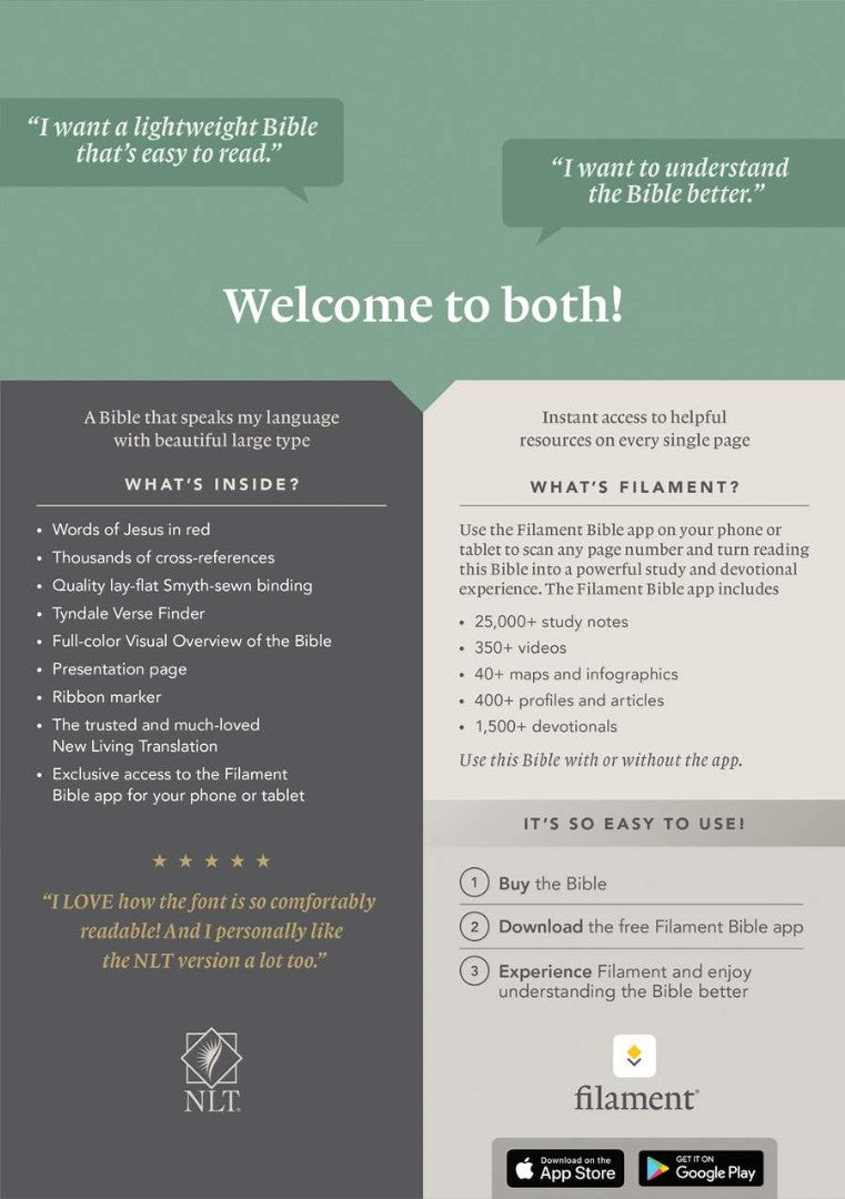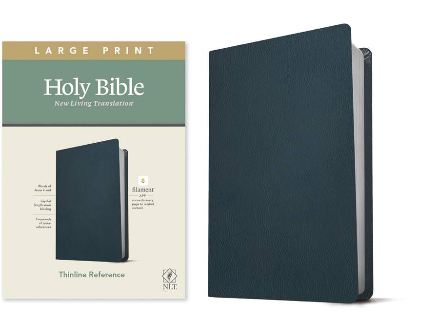 The Bible Reading Experience: Reimagined The new Tyndale classic NLT Large Print Thinline Reference Bible, Filament-Enabled Edition has readable text, an attractive layout, and cross-references in a thin, easy-to-carry size. And while it has the same low price as basic text-only Bibles, the NLT Large Print Thinline Reference offers much more. It not only features a bold new design and the trusted and much-loved New Living Translation (NLT) but also includes the groundbreaking Filament Bible app. This app enables you to use your mobile phone or tablet to connect every page to a vast array of related content, including study notes, devotionals, interactive maps, informative videos, and worship music. The Filament Bible app turns this Bible into a powerful study and devotional experience, offering more to expand your mind and touch your heart than you can possibly hold in your hand. And there is no additional cost for the Filament Bible app. No additional purchase. No additional size or weight. Of course, you can use this Bible without the app, but when you want to dig deeper, grab your phone or tablet and open the Filament Bible app. It’s so easy to use. Features:• New designs and Filament content for each page! • Readable large print • Handy thin size • Words of Jesus in red • Thousands of cross-references • Quality lay-flat Smyth-sewn binding • Tyndale Verse Finder • Presentation page • Ribbon marker • Gilded page edges Filament Bible app with free access to:• 25,000 study notes • 350+ videos • 40+ maps and infographics • 400+ profiles and articles • 1,500+ devotionals • Library of worship music