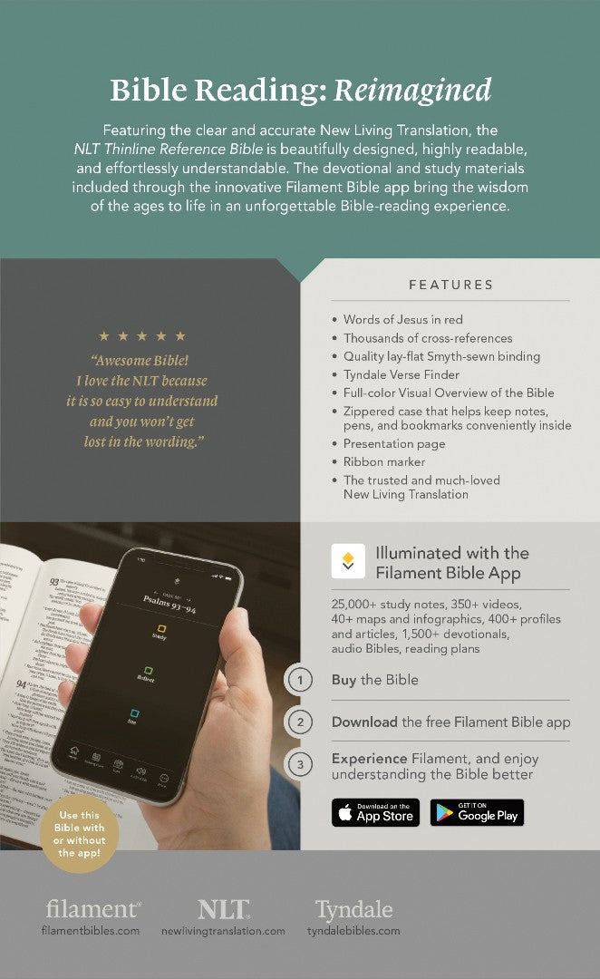 Your Bible Reading Experience: Reimagined The Tyndale NLT Thinline Reference Bible, Filament-Enabled Edition has readable text, an attractive layout, and cross-references in a thin, easy-to-carry size. And while it has the same low price as basic text-only Bibles, the NLT Thinline Reference offers much more. It not only features a bold new design and the clear and accurate New Living Translation (NLT) but also includes the groundbreaking Filament Bible app. This app enables you to use your smartphone or tablet to connect every page to a vast array of related content, including study notes, audio Bibles, devotionals, interactive maps, informative videos, and worship music. The NLT Thinline Reference Bible, Filament-Enabled Edition is perfect for those looking for a portable Bible with access to a wealth of resources at your fingertips. Special Features of this NLT Bible include: Filament content for each page! Handy thin size Words of Jesus in red Thousands of cross-references Quality lay-flat Smyth-sewn binding Tyndale Verse Finder Presentation page Ribbon marker Gilded page edges Elevate Your Bible Study with the Filament App Absolutely Free! Unlock a world of knowledge and inspiration right at your fingertips! The Filament Bible app is your gateway to a deeper, more enriching Bible-study experience. Seamlessly connect every page of your Bible to a treasure trove of resources, including: 25,000+ study notes by more than 40 scholars offering a deeper understanding of what you re reading audio Bibles to immerse you in God s Word anytime and anywhere 350+ videos to captivate you as you unpack key information about the background and meaning of the Bible 40+ maps and infographics explaining the geography and cultural background of the Bible 400+ profiles and articles revealing the people and stories behind the Scripture verses, enriching your connection with the text 1,500+ devotions providing daily inspiration and numerous opportunities for reflection a library of worship music offering the perfect soundtrack for personal study and worship Ready to dive deeper? Just grab your smartphone or tablet, open Filament, and let the learning begin. It s simple, convenient, and extremely enriching. Start your enhanced Bible journey today! The New Living Translation is a clear and accurate English translation of the Bible. It s easy to understand, and it conveys the precise meaning of the original languages in a flowing, effortless writing style that promotes comfortable and meaningful reading.