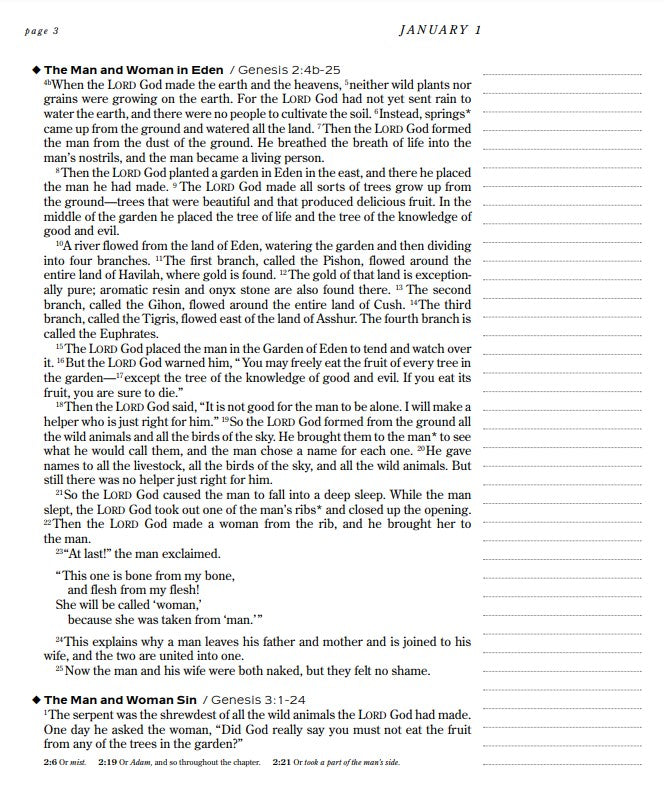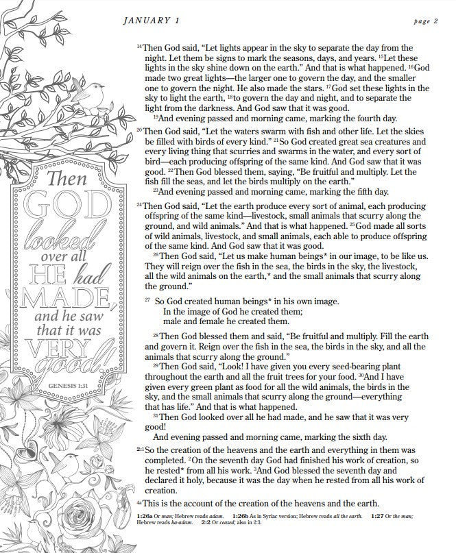The #1-selling daily reading Bible is more personal than ever with space to read, write, and create! With generous two-inch, lightly-ruled margins and more than 100 artfully drawn verses waiting to be filled in with your most creative ideas, your daily reading experience has never been more personal. The One Year Chronological Bible Expressions contains the entire text of the New Living Translation divided into 365 daily readings. Each day’s reading focuses on a specific moment in biblical history, taking you through the events of the Bible in the order they occurred. Readers are guided through the entire Bible in a sequential, unforgettable journey that’s easier than ever to make your own.