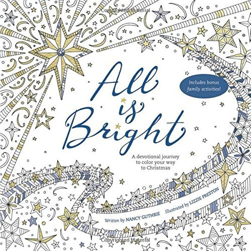 The perfect gift for the creatives and coloring-book lovers in your life! Includes bonus activities and kid-friendly coloring pages for the whole family! This Christmas season, celebrate the birth of our Savior through beautiful design and devotion. Grab your colored pencils, cozy up with your favorite blanket and a cup of tea, and settle in for a night of peace and wonder with All Is Bright. For lovers of the Secret Garden and Enchanted Forest coloring books, All Is Bright is the perfect way to transform the Advent and Christmas seasons for your whole family, re-centering the holidays on the miracle of Jesus? birth. Combining 31 days of rich content by the beloved and inspirational Nancy Guthrie with intricate designs that will reconnect you with the heart of Christ, this coloring book devotional journey reminds us all of what the season really calls us to: worship.