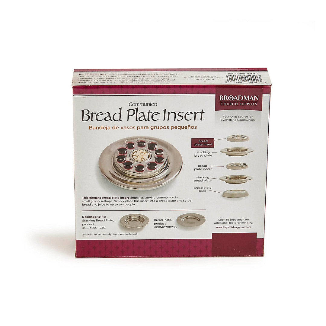 Serving small group Communion settings is simplified with this beautiful insert. Place this Insert into a bread plate you already have in your church's Communion serving set and serve bread and juice to 10 people. This insert is designed to fit in most Communion bread plates.