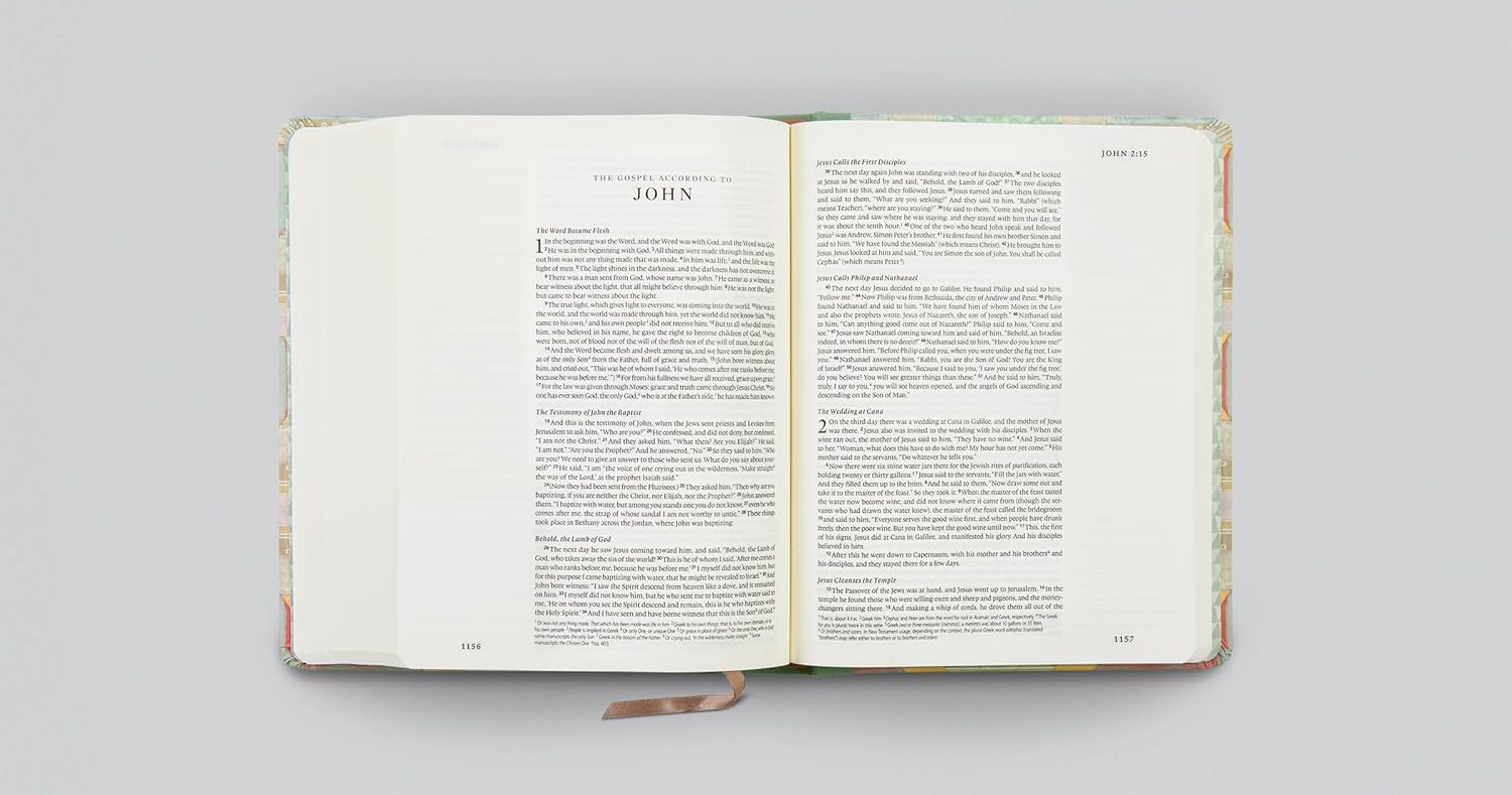 The ESV Single Column Journaling Bible, Artist Series is a collection of journaling Bibles meant to celebrate the treasure of God's Word through the artistic talents of his people. These Bibles feature commissioned cover artwork designed by Christian artists such as Ruth Chou Simons, Lulie Wallace, and Joshua Noom. Each artist offers a visual entry point focused on a particular biblical theme or passage, setting a tone of awe as readers engage with the Bible.