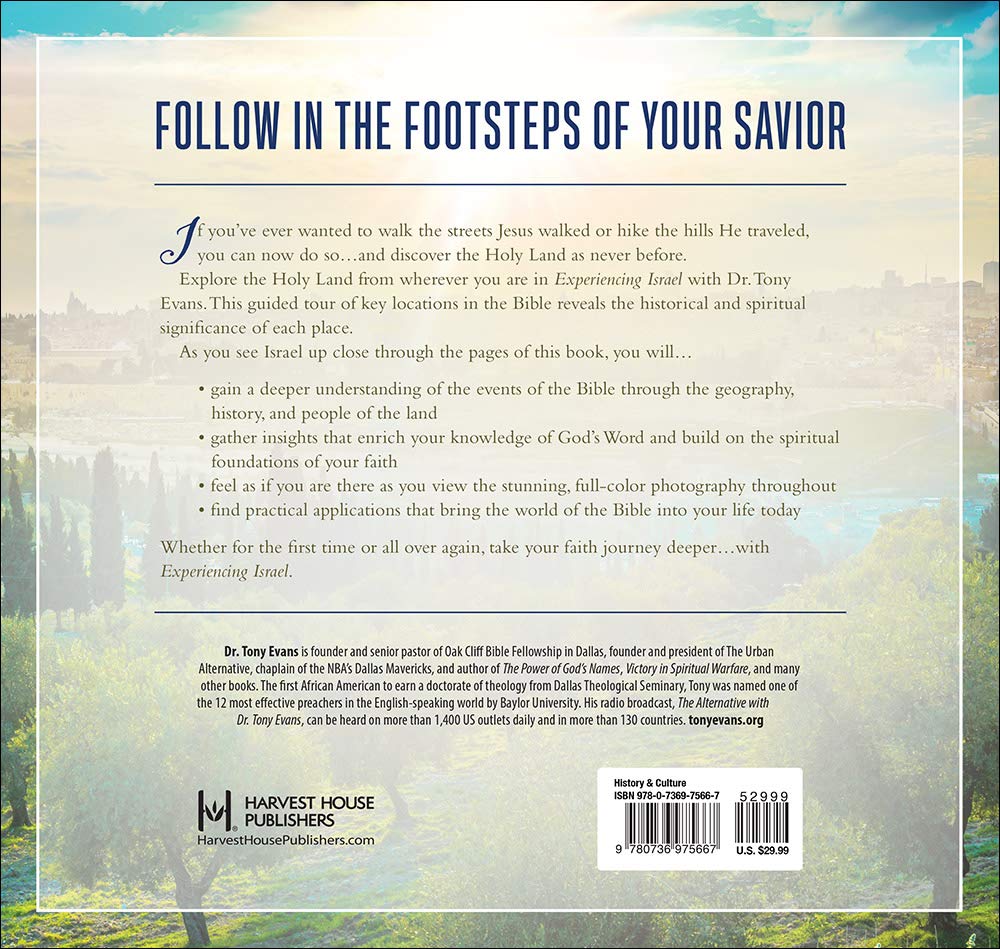 Follow in the Footsteps of Your Saviour If you’ve ever wanted to walk the streets Jesus trod, hike the hills He travelled, pass through the doorways He entered, you can now discover the Holy Land like never before. Journey with bestselling author Dr. Tony Evans from wherever you are and explore the Holy Land in Experiencing Israel.